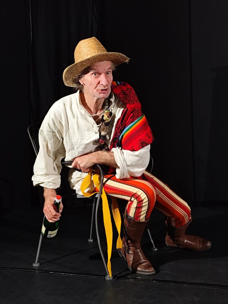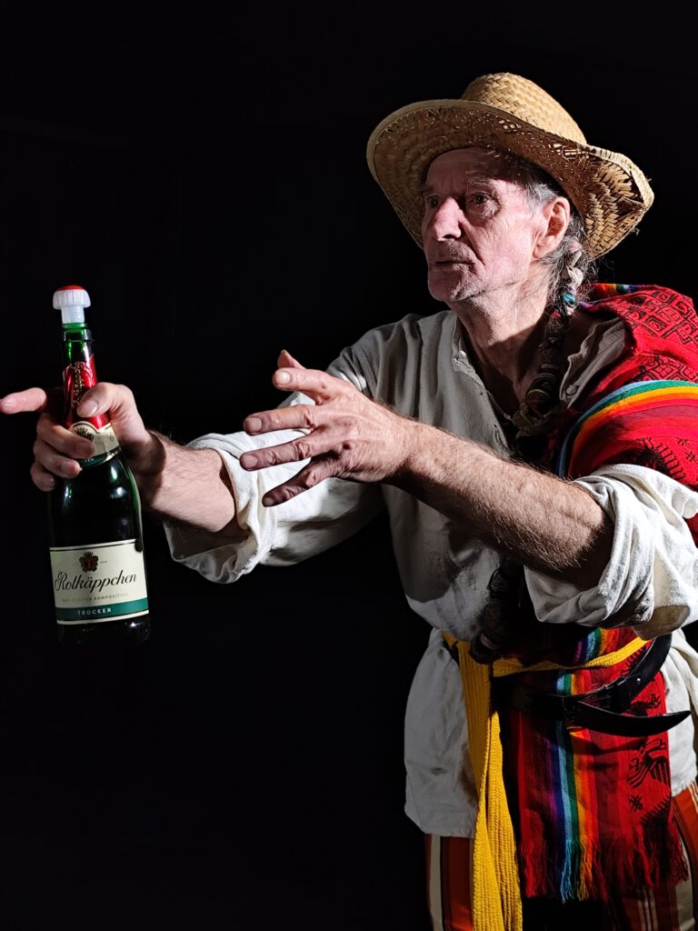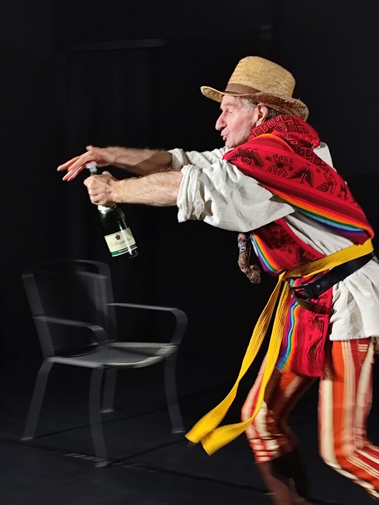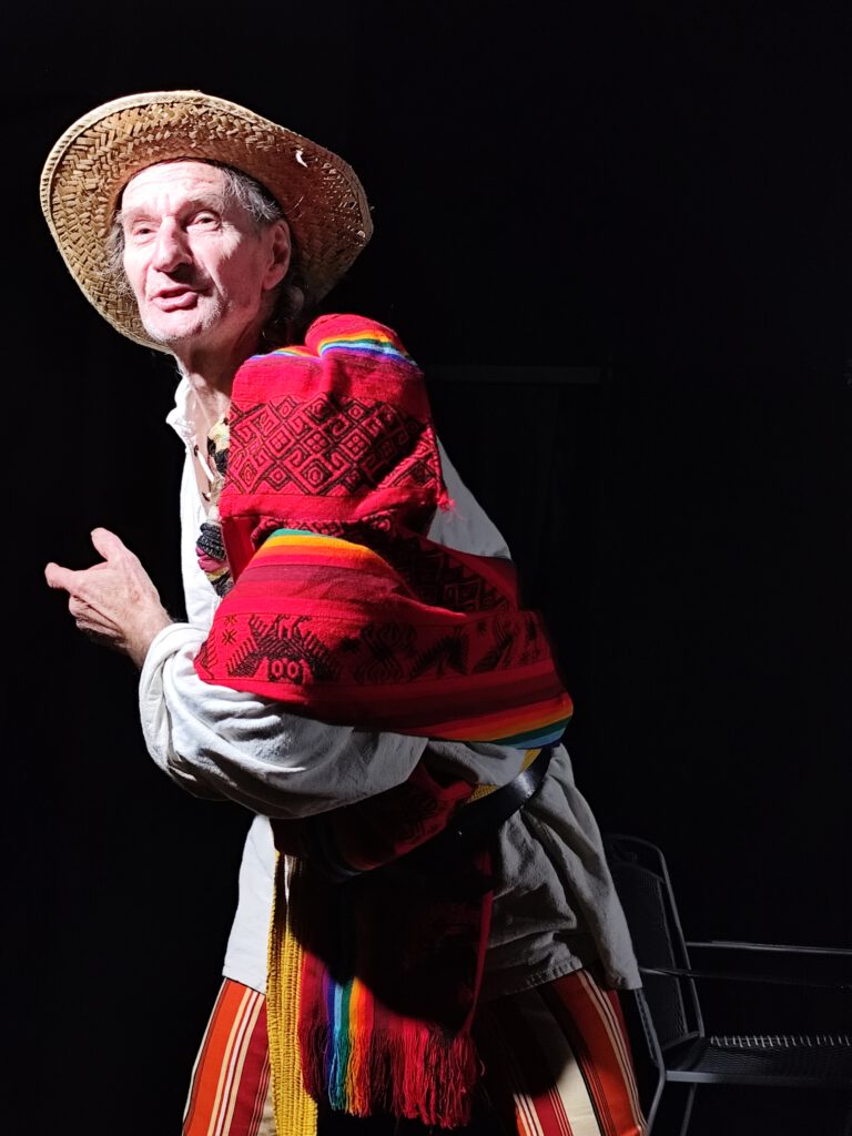 Wir zeigen die Jakobiner-Figur des St. Just mit seiner Rede vor dem Konvent aus dem Revolutionsdrama Dantons Tod als alten lateinamerikanischen Revolutionär – versetzt 1789 km von Paris entfernt, wo wir „komischerweise“ weit entfernt sind von den einst bürgerlich erträumten weltweiten Verhältnissen echter sozialer Gerechtigkeit und einem mit ihnen einghergehenden Weltfrieden unter dem Banner der Trikolore: Freiheit, Gleichheit, Brüderlichkeit …