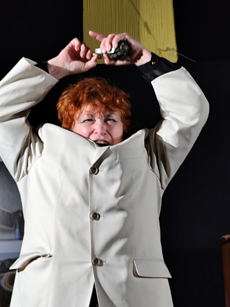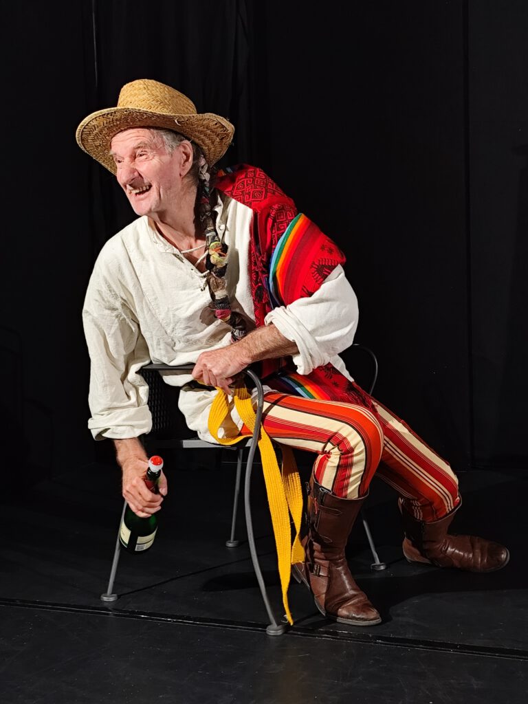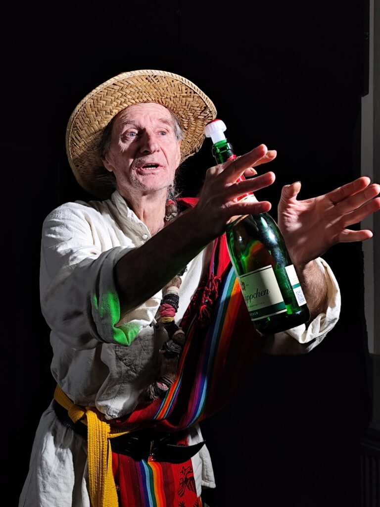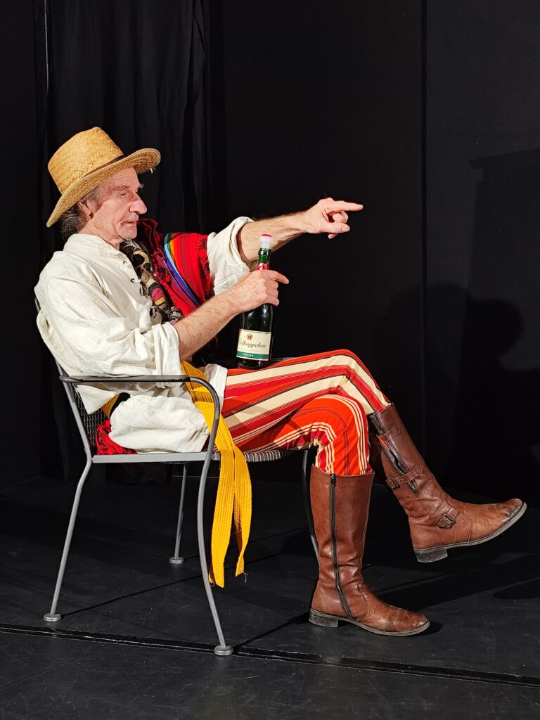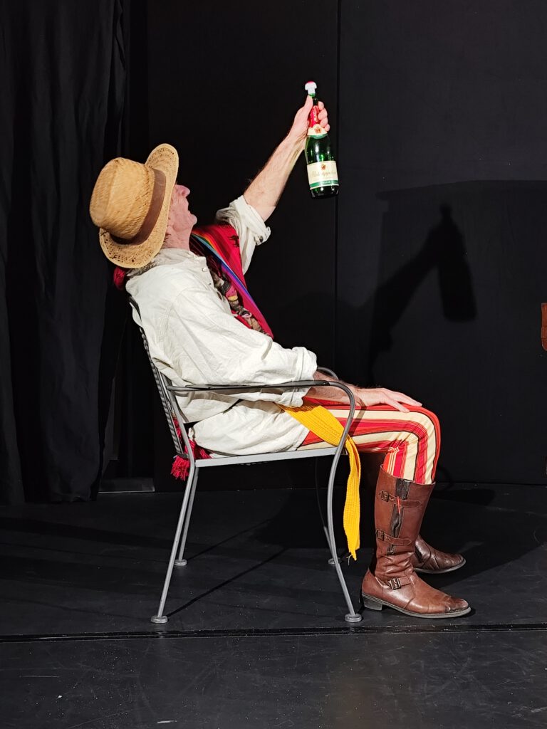 Wir zeigen die Jakobiner-Figur des St. Just mit seiner Rede vor dem Konvent aus dem Revolutionsdrama Dantons Tod als alten lateinamerikanischen Revolutionär – versetzt 1789 km von Paris entfernt, wo wir „komischerweise“ weit entfernt sind von den einst bürgerlich erträumten weltweiten Verhältnissen echter sozialer Gerechtigkeit und einem mit ihnen einghergehenden Weltfrieden unter dem Banner der Trikolore: Freiheit, Gleichheit, Brüderlichkeit …